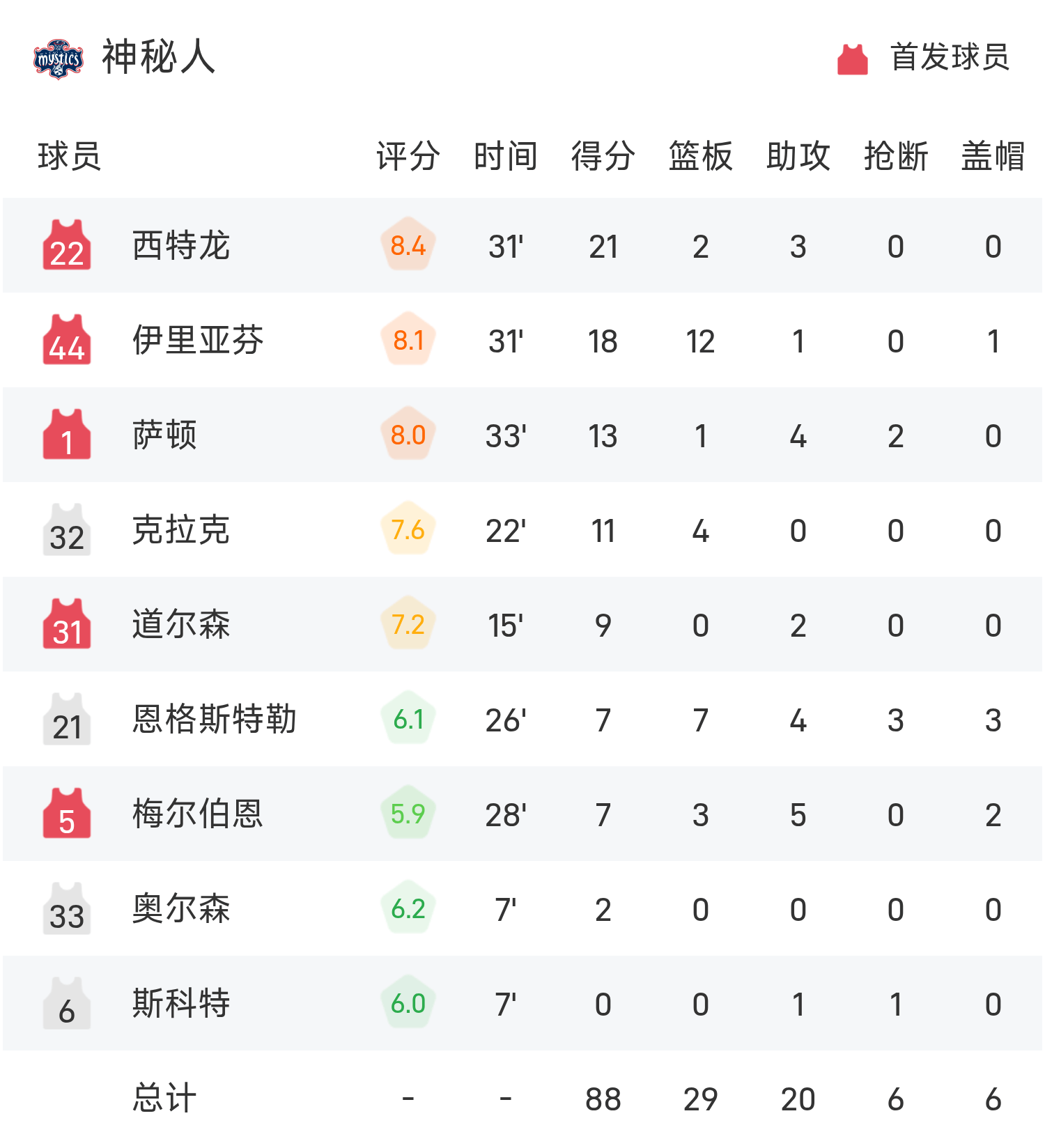 08月16日讯 25赛季WNBA 常规赛,狂热对阵神秘人。双方全场战罢,狂热84-88不敌神秘人。西特龙砍下全场最高的21分2板3助,率领神秘人成功取胜。